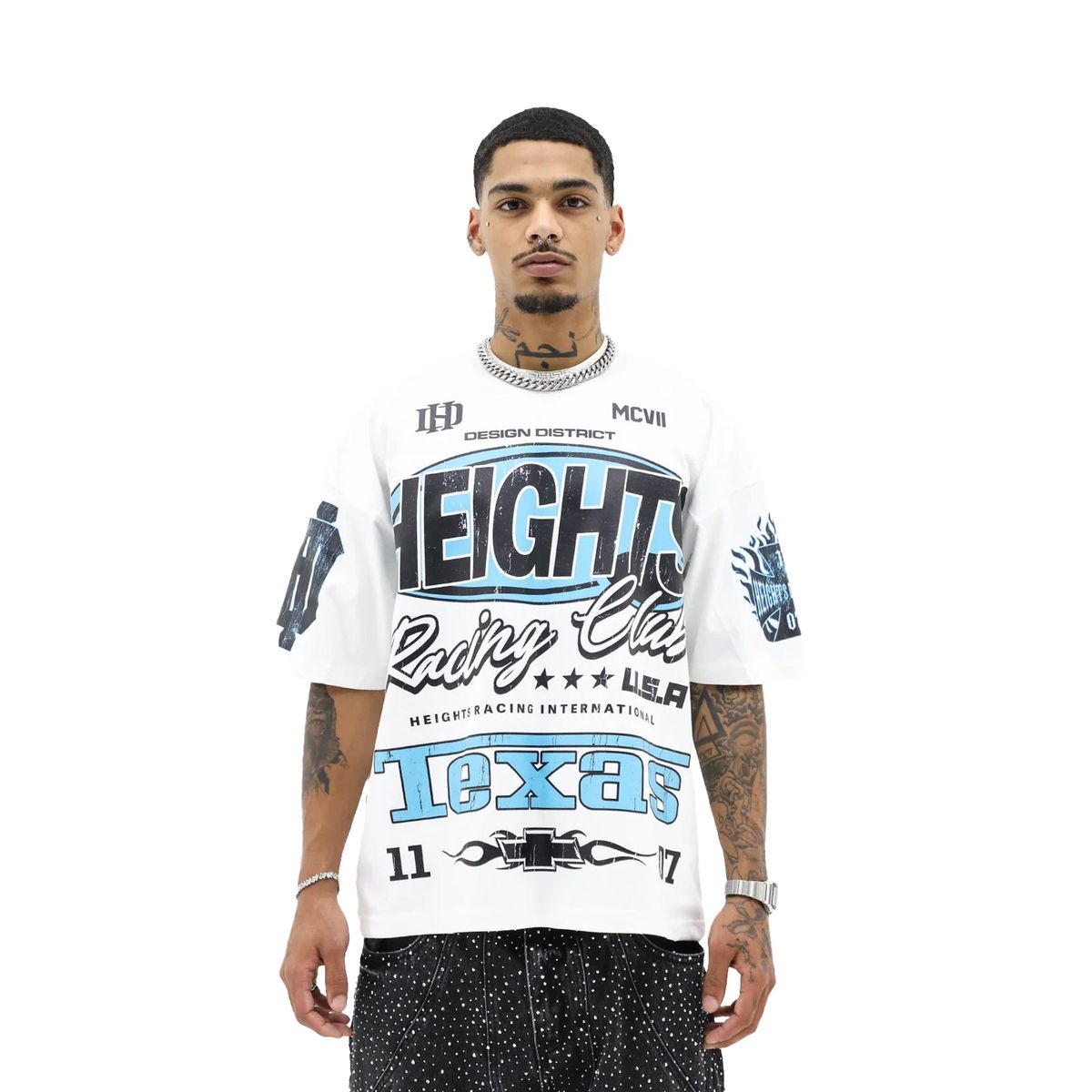 Our designer went crazy with this one. The Heights Racing Club tee features bold Texas-inspired graphics printed all over—front, back, and sleeves. Built on our 9.0 oz designer tee with drop shoulders, oversized feel, and true to size fit. It delivers high-speed energy and heavyweight comfort. Pair it with the matching shorts for the full fit.